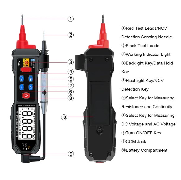 - Pratik Tasarım: FSH1 multimetrenin kompakt ve cep boyutundaki tasarımı onu son derece taşınabilir ve kullanıcı dostu hale getirir. Kalem tipi form faktörü, bir cebe veya alet kutusuna rahatça sığmasını sağlayarak, gerektiğinde alete rahatça erişim sağlar. Hafif ve ergonomik tasarımı, uzun süreler boyunca rahat kullanım sağlar ve onu hem profesyonel hem de kişisel kullanım için pratik bir seçim haline getirir.